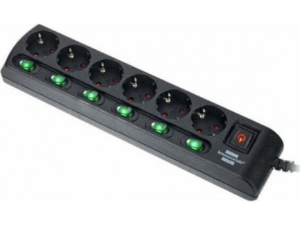 - 6 υποδοχές πρίζας με ξεχωριστούς φωτεινούς διακόπτες