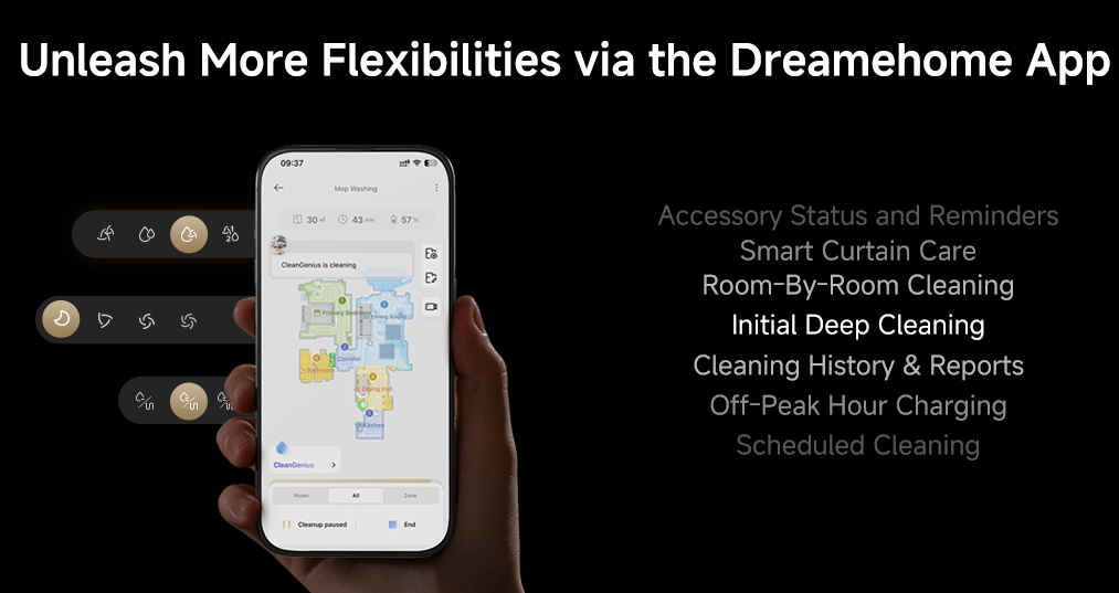 Με το Dreamehome App, έχεις τη δυνατότητα να επιλέξεις ανάμεσα σε διάφορες έξυπνες λειτουργίες για κάθε τύπο χαλιού: από αποφυγή χαλιού για υγρά καθαρίσματα, ανύψωση σφουγγαριού για λεπτά χαλιά, έως διπλό πέρασμα για πιο βαθύ καθαρισμό ή ενίσχυση απορρόφησης όπου χρειάζεται. Εσύ διαλέγεις, αυτό προσαρμόζεται! Εάν έχεις κατοικίδια, τα χαλιά σου επιτέλους θα παραμείνουν καθαρά χωρίς τρίχες και υγρασία.