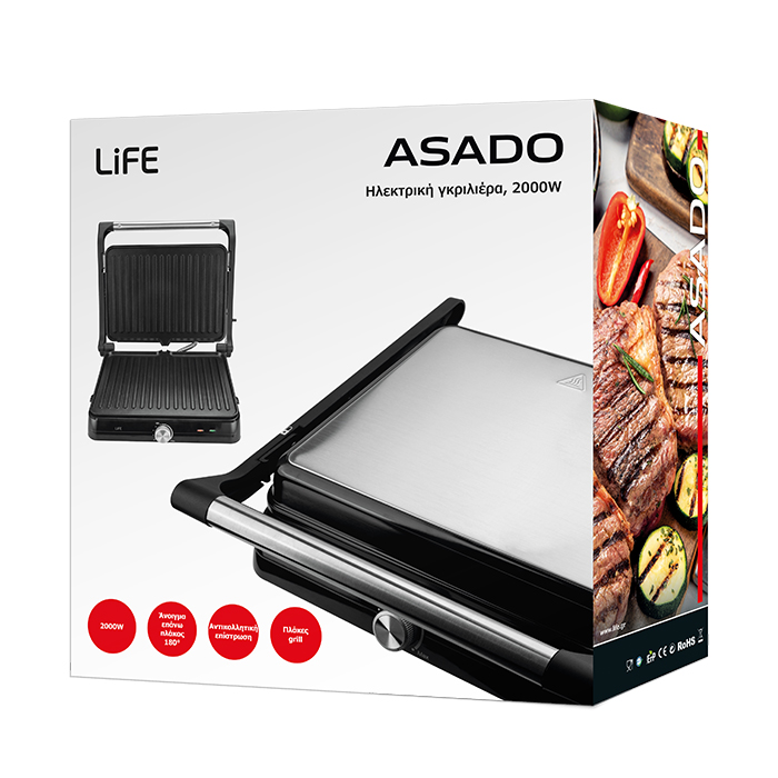 Η ηλεκτρική γκριλιέρα LIFE ASADO διαθέτει μεγάλες αντικολλητικές πλάκες μεγέθους 29 x 23cm και ισχύ 2000W, για γρήγορο και ομοιόμορφο ψήσιμο κρεατικών, λαχανικών και τοστ!