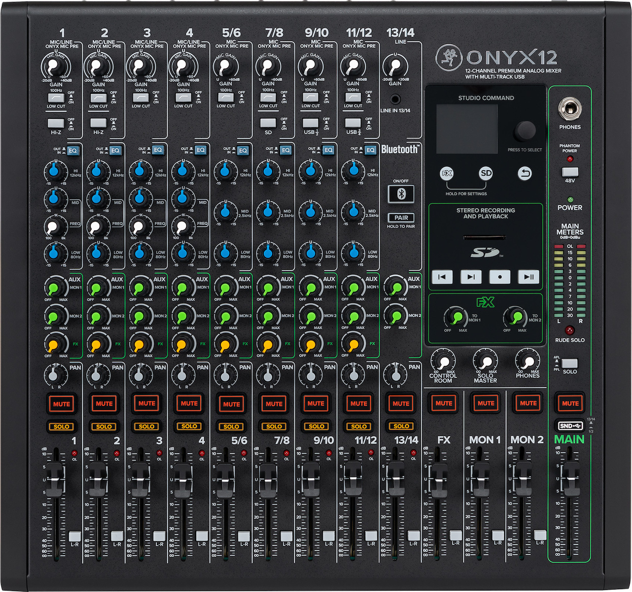Mackie Onyx12 premium αναλογική κονσόλα ήχου 12 καναλιών με USB. Ιδανική για live performance, home studio ηχογραφήσεις και δημιουργία περιεχομένου.