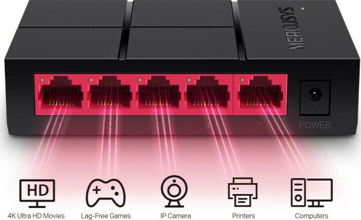 - Πέντε θύρες auto-negotiation 10/100/1.000 Mbps RJ45 με auto MDI / MDIX