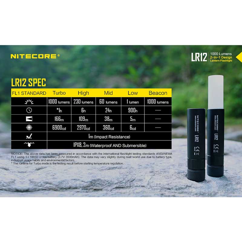 - Ενσωματωμένος εκτεινόμενος διαθλαστής επιτρέπει στον LR12 να λειτουργεί ως φακός και ως φαναράκι.