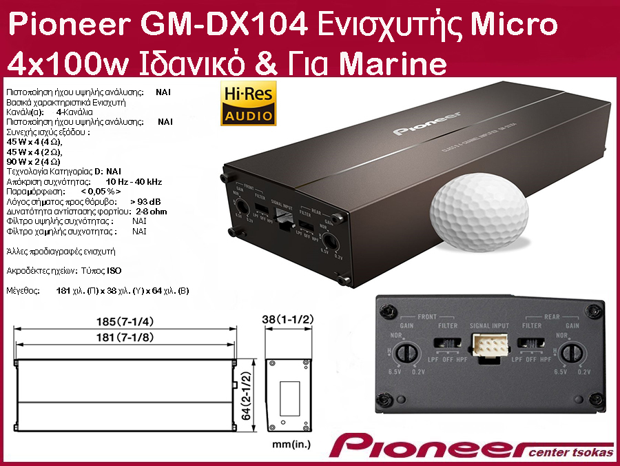 Ο ενισχυτής GMDX104 της εταιρείας Pioneer επιτρέπει την αύξηση της ισχύος των ηχείων του αυτοκινήτου. Πρόκειται για μια συσκευή που ενισχύει το ηλεκτρικό σήμα που λαμβάνει από το ηχοσύστημα του αυτοκινήτου και το μεταφέρει στα ηχεία για αναπαραγωγή. Είναι ένας τετρακάναλος ενισχυτής, που σημαίνει πως μπορεί να τροφοδοτήσει έως και τέσσερα ηχεία.