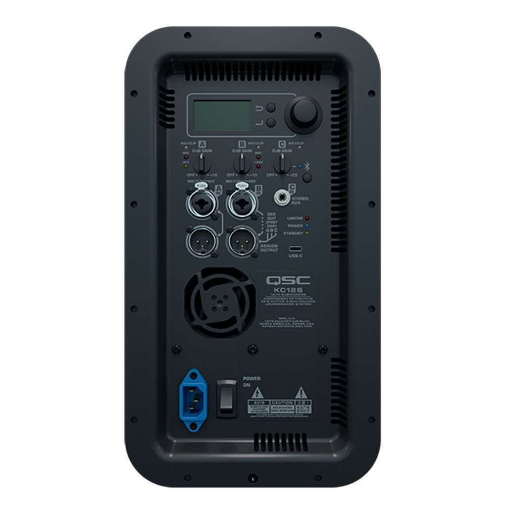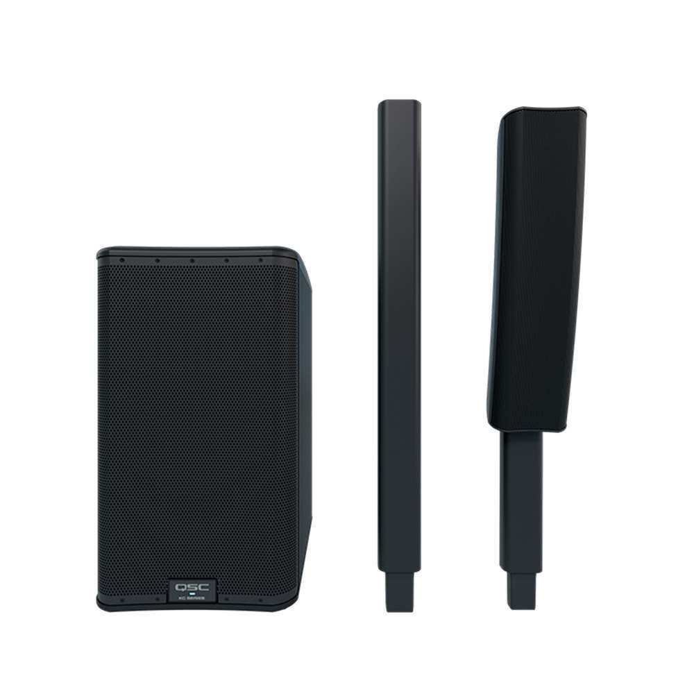 QSC KC12, αυτοενισχυόμενο σύστημα (set) ηχείων τύπου ηχοστήλη, 3 δρόμων που αποτελείται από, 1 subwoofer 12 ιντσών, 2 υψηλής εκτροπής midrange ηχεία 4 ιντσών και 1 tweeter 1 ίντσας, συνολικής Peak ισχύος 3000W με ενίσχυση κλάσης D, απόκριση συχνότητας 45Hz - 18.5kHz στα -6dB, εύρος συχνοτήτων 40Hz - 20kHz στα -10dB και Max Rated SPL (Peak) 132dB.