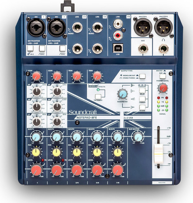 Κονσόλα μίξης 2 mono/line, 3 stereo line, περιστροφικά ποτενσιόμετρα σε κάθε κανάλι, Gain, ΕQ 3 περιοχών, 1AUX/FX send, balanced, High Pass filter σε όλα τα mono inputs 1AUX/FX send, balanced και trim σε κάθε στερεοφωνική είσοδο.