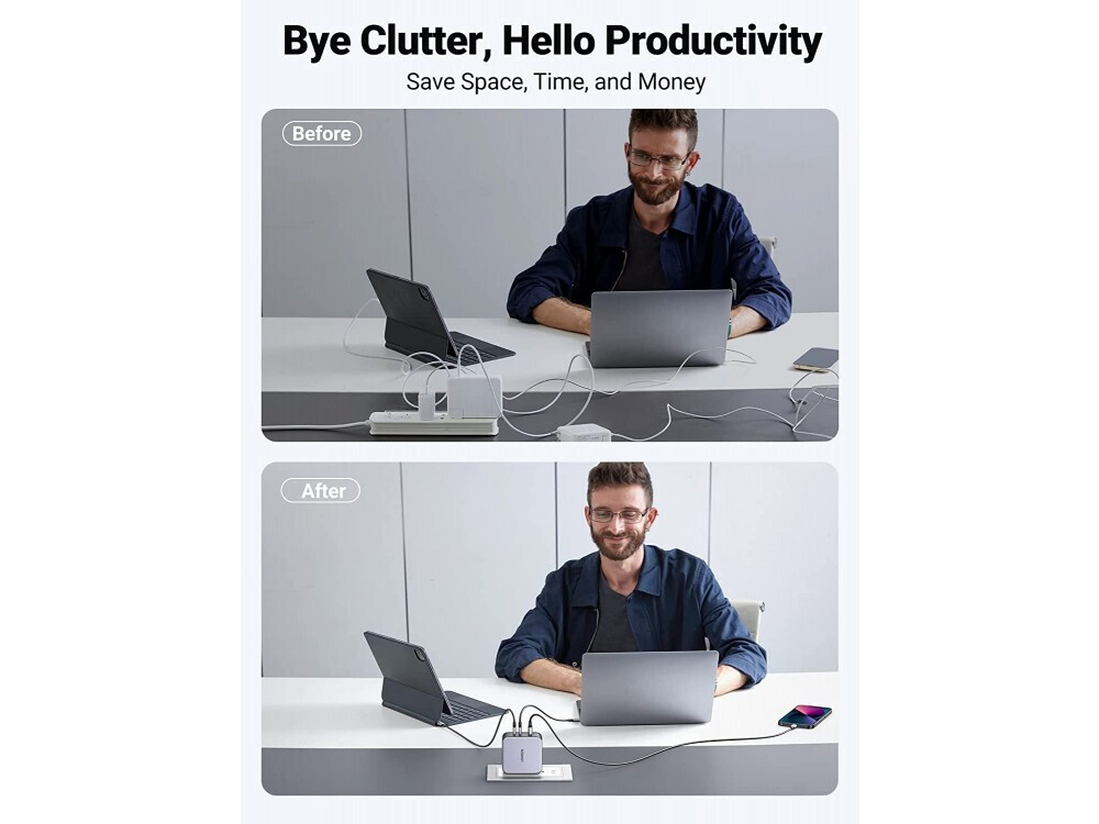 Φόρτιση πολλαπλών θυρών 3 σε 1: Δύο θύρες USB-C και μία θύρα USB-A υποστηρίζουν τη φόρτιση δύο φορητών υπολογιστών και ενός τηλεφώνου ταυτόχρονα με ταχύτητες που είναι απαραίτητες για έναν χρήστη τεχνολογίας πολλών συσκευών. Περιλαμβάνεται καλώδιο ταχείας φόρτισης 5FT 240W Type-C σε C