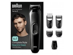 Σετ κουρευτικής μηχανής της εταιρίας Braun, κατάλληλο για χρήση σε περιοχές όπως τα μαλλιά, τα γενιά και το σώμα. Λειτουργεί με μπαταρία και παρέχει έως και 50 λεπτά αυτονομίας. Στη συσκευασία περιέχονται 5 εξαρτήματα.